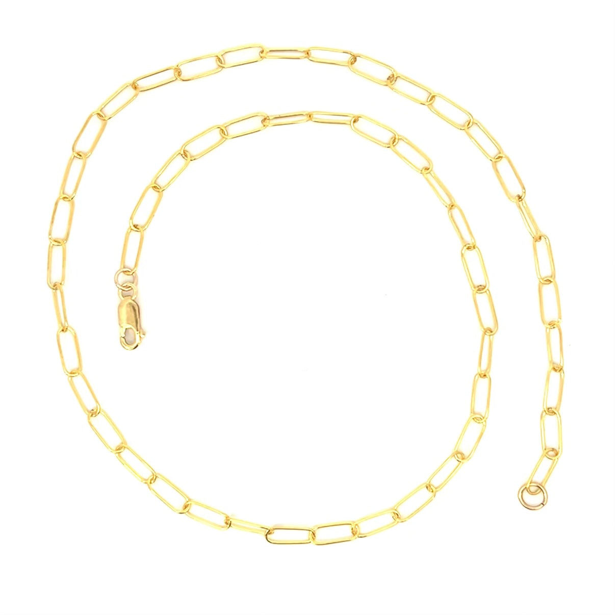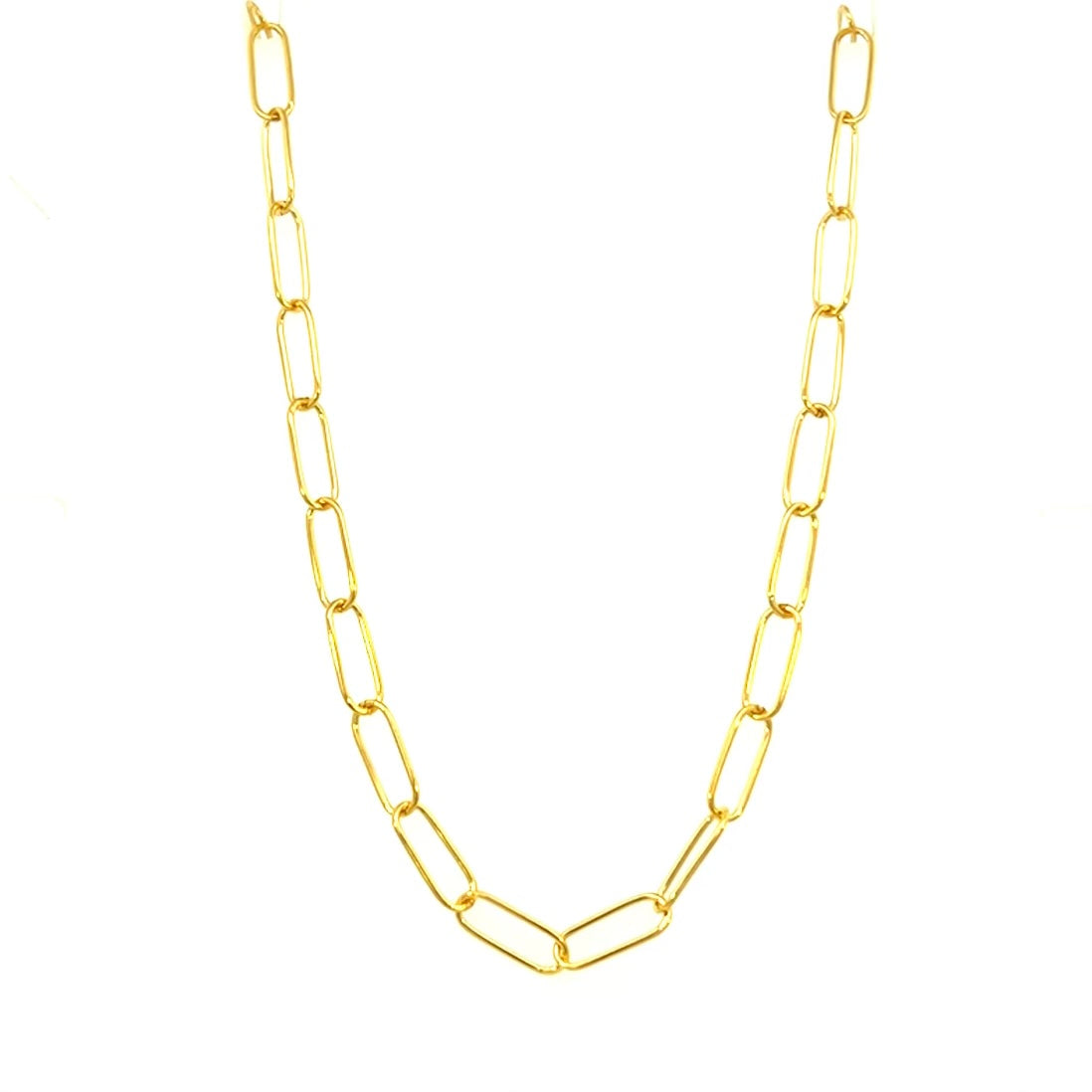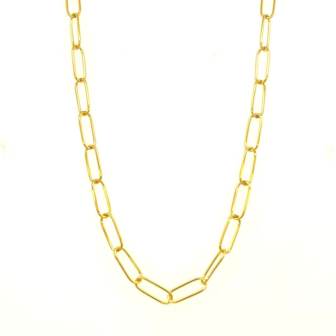 This 14k gold filled paperclip chain is an absolute must for every gold jewelry lover. This is a noticeable, generous sized chain. The links are 11 mm in length and 4 mm wide. This is an affordable, yet beautiful option to a full 14K chain. It is water proof and hypoallergenic, perfect for every day wear. The length is 20”.