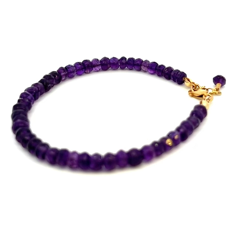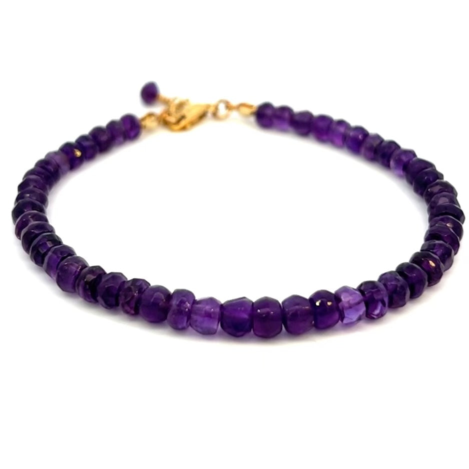 This is a 14k Gold Filled Bracelet with genuine African Amethyst. Amethysts are believed to bring the wearer clear headedness and fast Witt. This beautiful bracelet has a 14k gold filled Extender Chain and lobster clasp. It is adjustable at approximately 7 1/2 - 8”. The beads range from about 4-5mm in width.