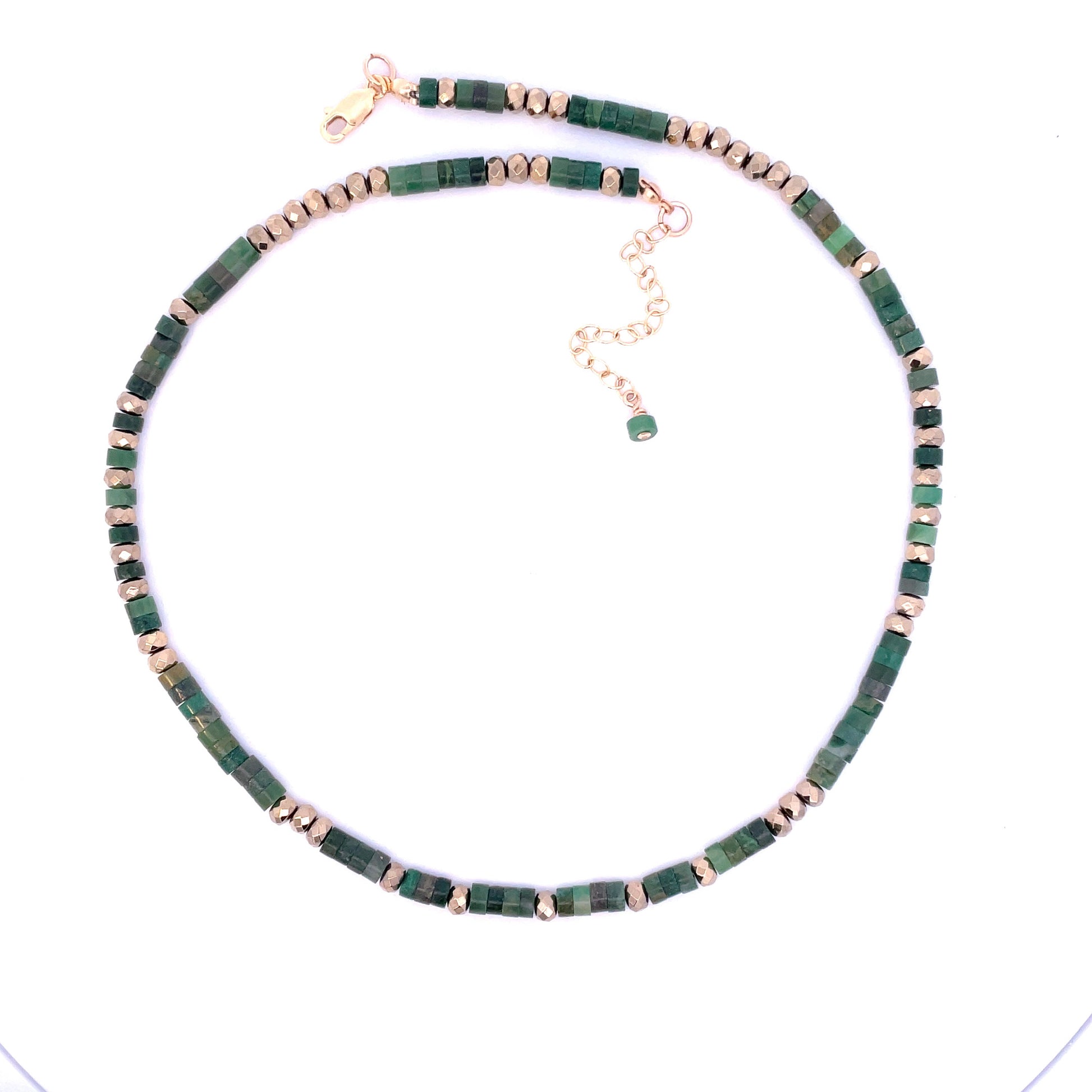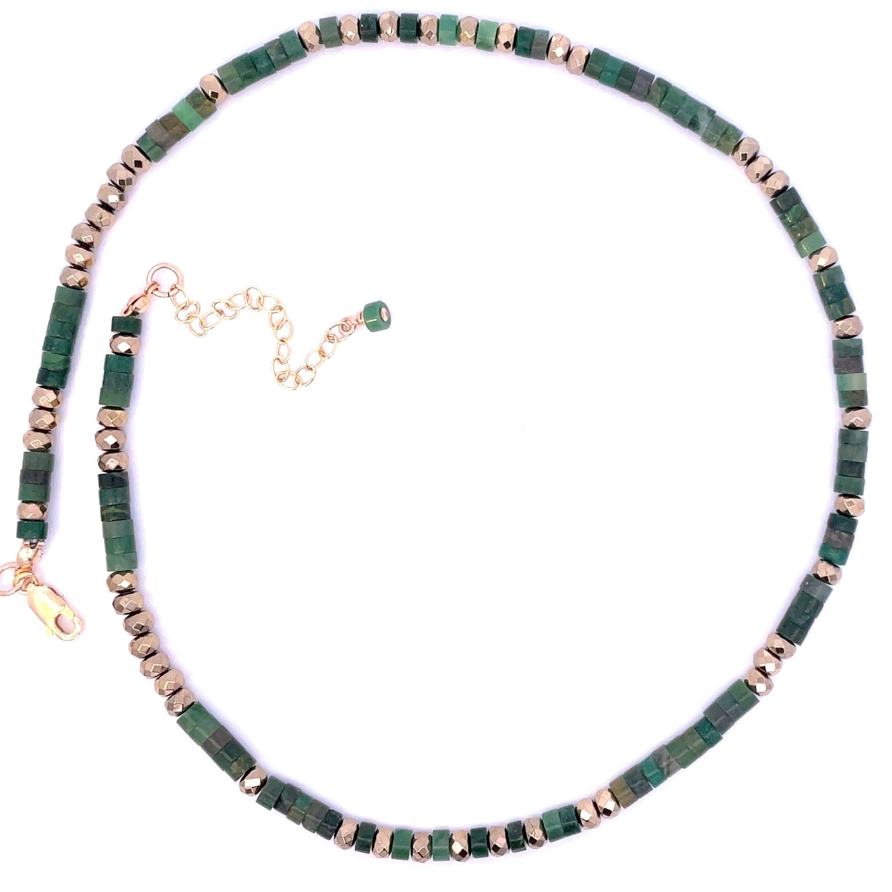 This is a natural gemstone African Green Jade and Pyrite choker necklace. The beads are a “drum” or “heishi” style that are arranged in a random, yet symmetric pattern. This is a classic style that is currently a hot trend. This can be worn as a choker at 16” with an extension chain to wear at a necklace length up to 18”. The beads are 4mm in size, dainty enough to layer with other necklaces, yet large enough to make a statement on its own. The lobster clasp and chain are 14k gold filled and will stay beautiful for many years with proper care. The Pyrite beads have a titanium coating to ensure lasting beauty. These are natural AAA quality gemstones, the best quality available.
