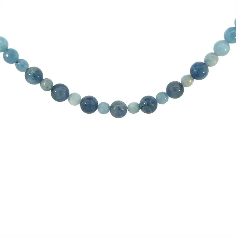 This is a Natural Gemstone Aquamarine Necklace with a mixture of different shades of blue. The beads are AAA quality, dark, medium and a lighter hue blend of aquamarine. Aquamarine is the March birthstone. This has a Sterling Silver lobster claw clasp and extender chain. The beads range in size from 5 mm- 7 mm in size. It is adjustable from about 18-20”.