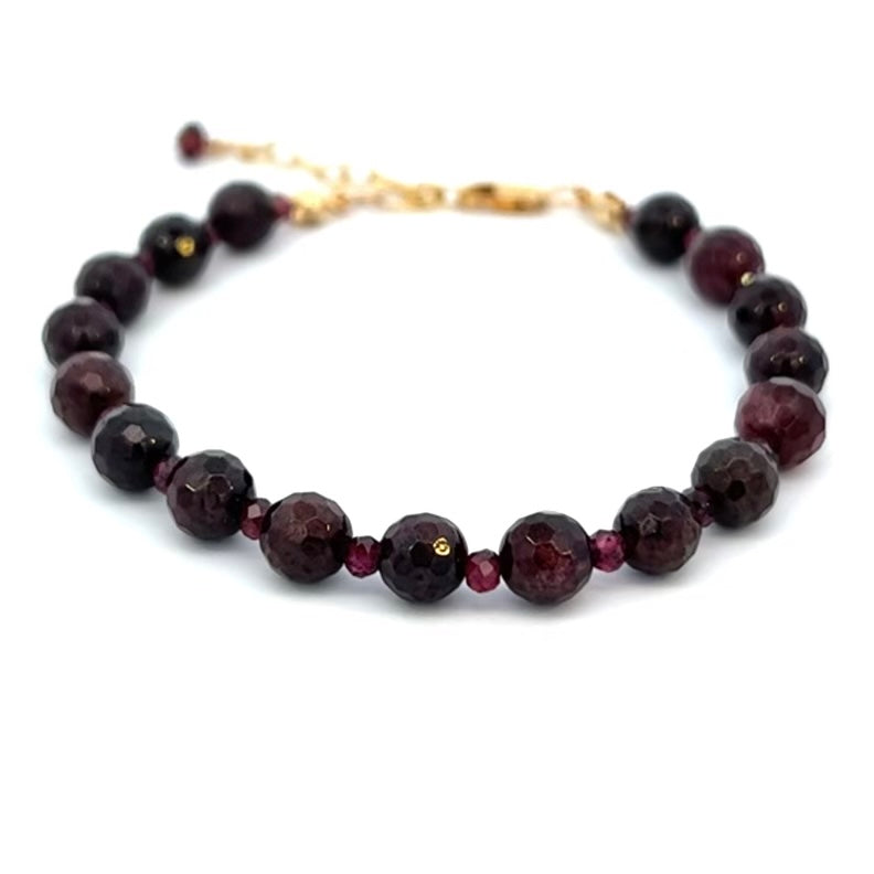 This gorgeous bracelet is a blend of AAA quality, natural gemstone garnets. The beads are a deep red, juicy, berry color, similar to pomegranates. The 14k gold filled chain is adjustable from approximately 7-8” and has a 14k gold filled lobster clasp. The larger beads are 6 mm and the smaller beads are 3 mm.