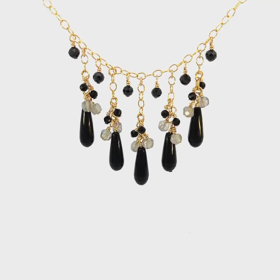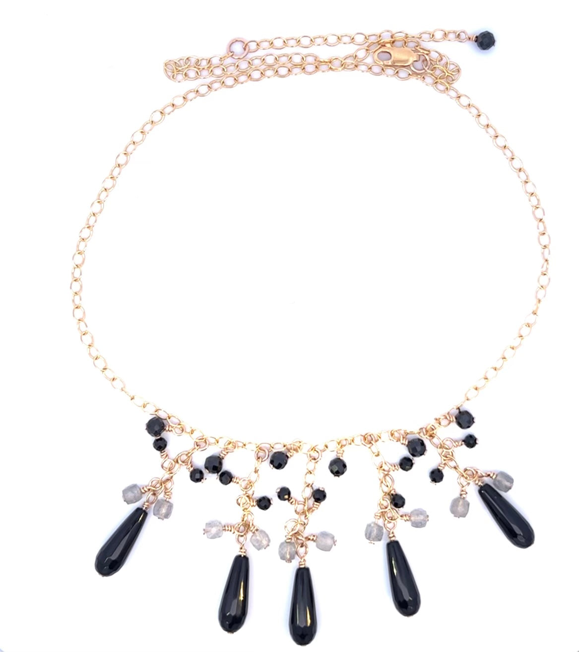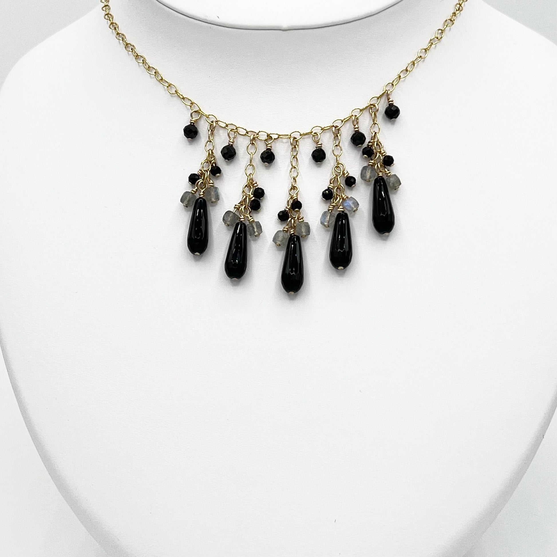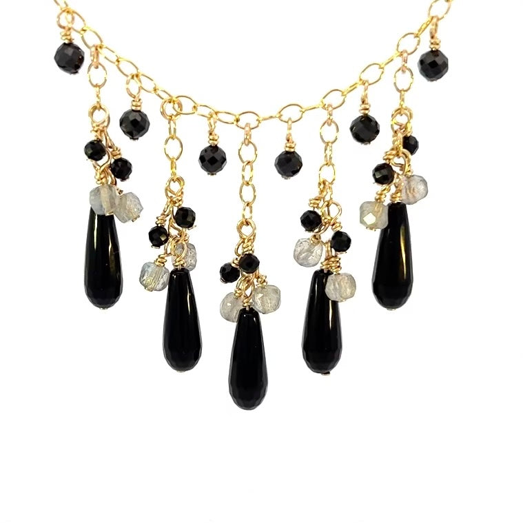 This is a natural gemstone Black Onyx, Black Spinel and Labradorite choker necklace. The Black Spinel and Labradorite beads add a beautiful accent to the long Black Onyx teardrops. This makes a statement as a choker or necklace and is adjustable from approximately 16-18” in length. The chain and lobster clasp are 14k gold filled. These are all top quality, AAA beads. The Black Spinel sparkles like black diamonds and the Labradorite has blue flashes in the light. This elegant choker/ necklace would be perfect for a formal event or as a cherished gift.