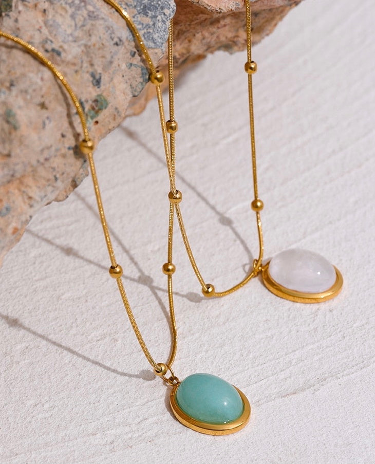 This stylish necklace has a blue pendant that looks like a gorgeous aquamarine. The chain is gold plated with bead stations, giving it a high end look. It is adjustable from 16-18”. This necklace is also available with a white moonstone look pendant.