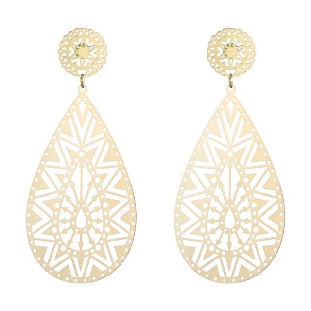 This is a pair of big and bold teardrop shape earrings. They have a fancy, filigree or lacy cut design. These are very edgy and make a big statement! They are about 3 1/2” long and 1 1/2” in width.