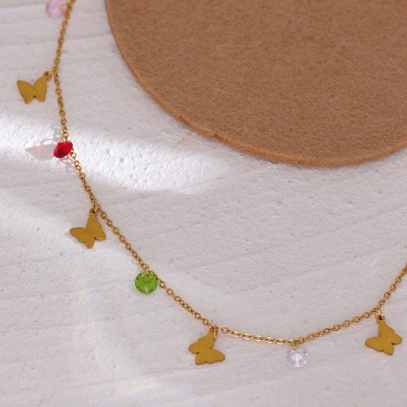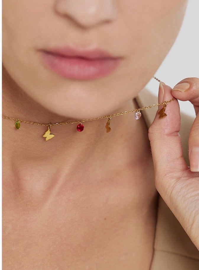 This is a dainty butterfly and crystal charm choker/necklace. The butterfly charms are very dainty at about 1/4” wide. The crystals are almost 1/4” wide and are green, red, pink and clear. It is adjustable from about 16”-18”.