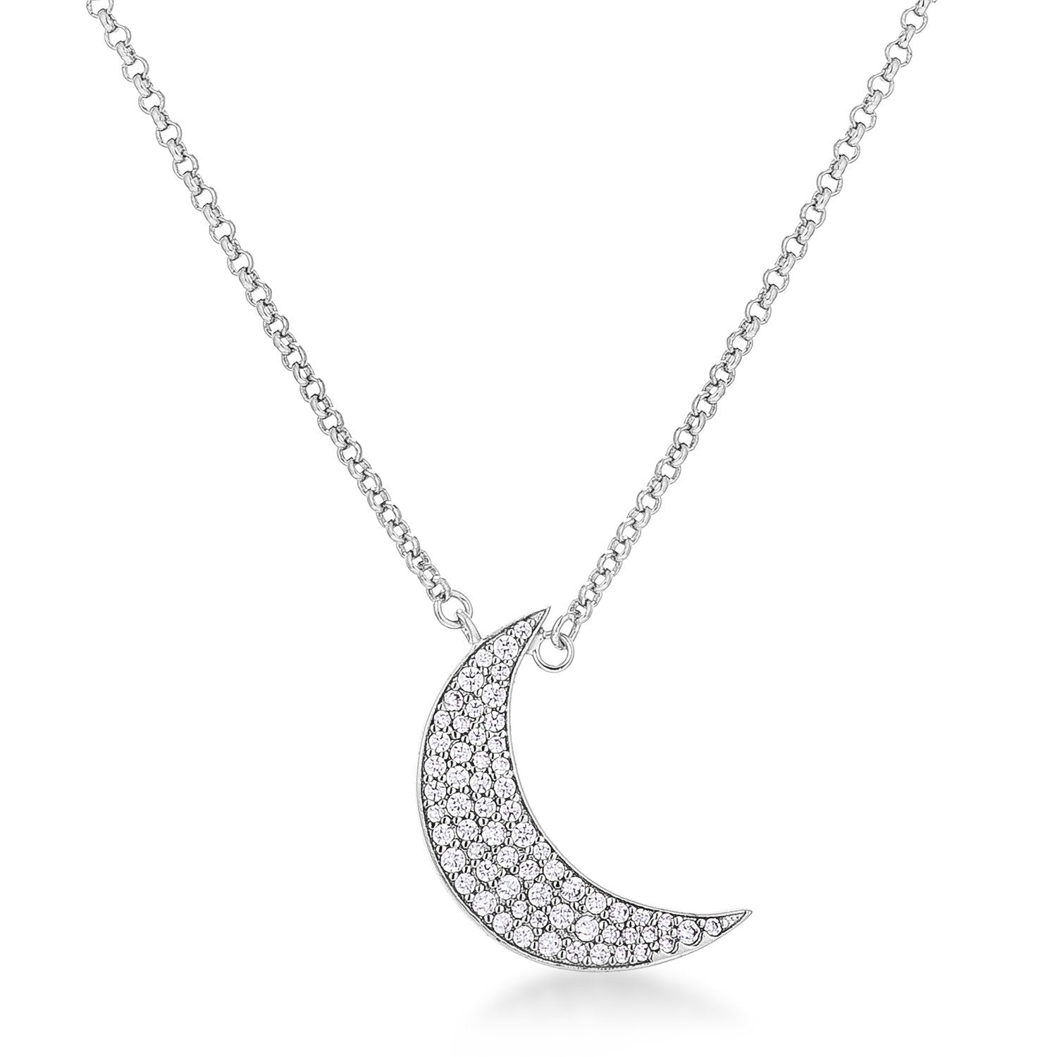This pretty crescent moon pendant necklace is so on trend and will look great with practically any outfit. The chain is 16” plus a 2” extender. The moon is about 3/4” in length. This is plated with rhodium to help retain its beauty. The CZ crystals have a nice sparkle. This is a wonderful quality item that will look great alone or layered with other chains. It must be seen in person to appreciate just how pretty it is.