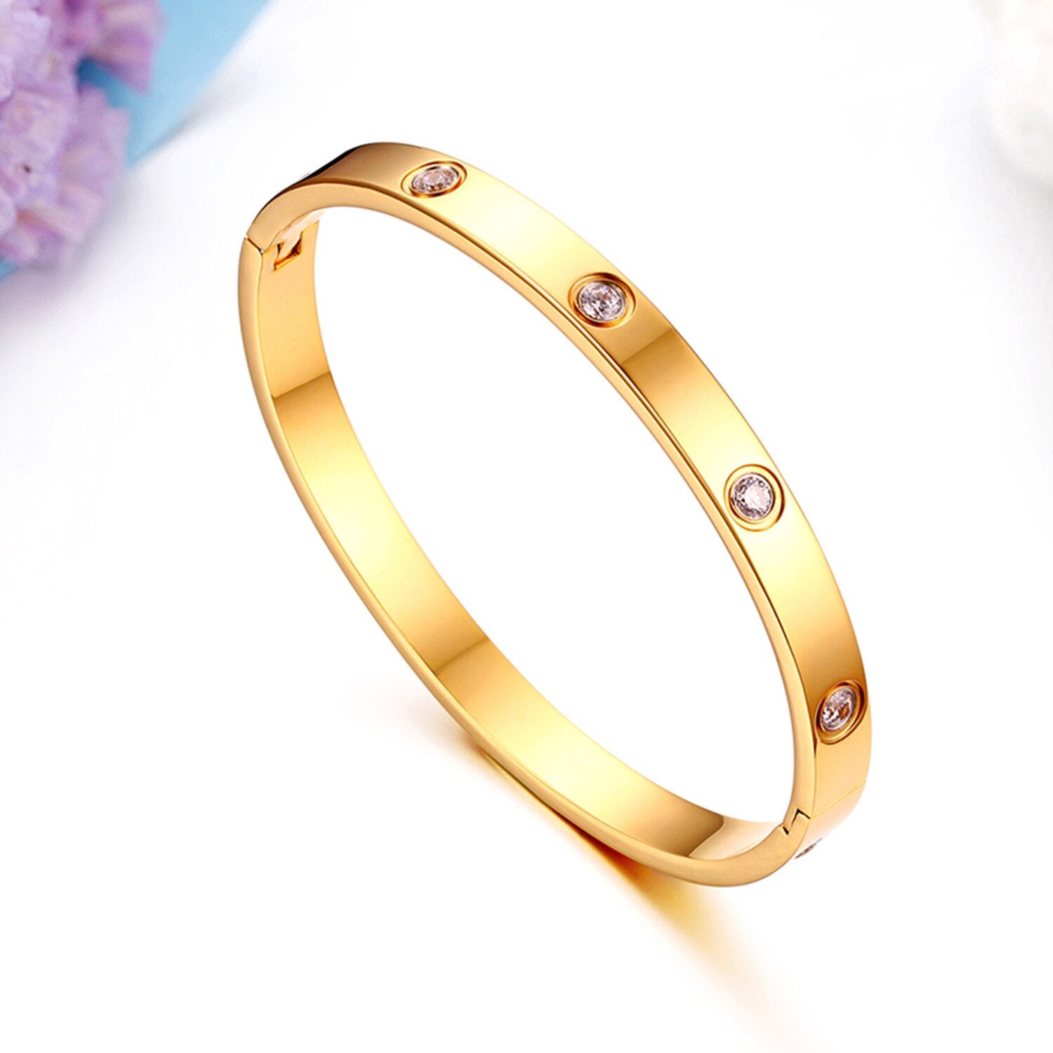 This is so on trend, but a forever classic studded bangle bracelet. The nailhead studs have crystals in them for added sparkle and style. Made of stainless steel. Buy one or more and stack with your other favorite bracelets. This has a hinged opening and will fit most wrist sizes. This bracelet is unbelievably high end looking and great quality for the price!