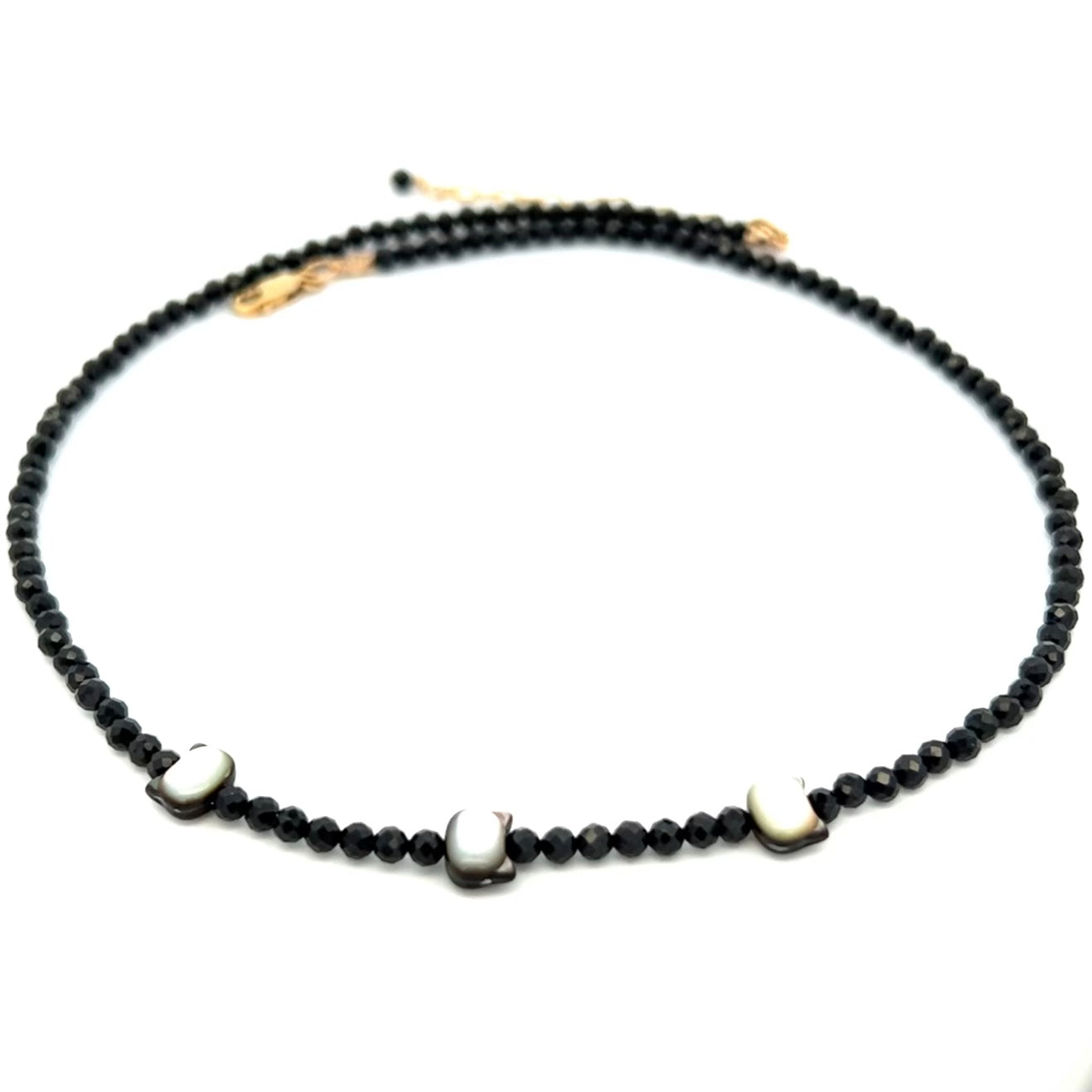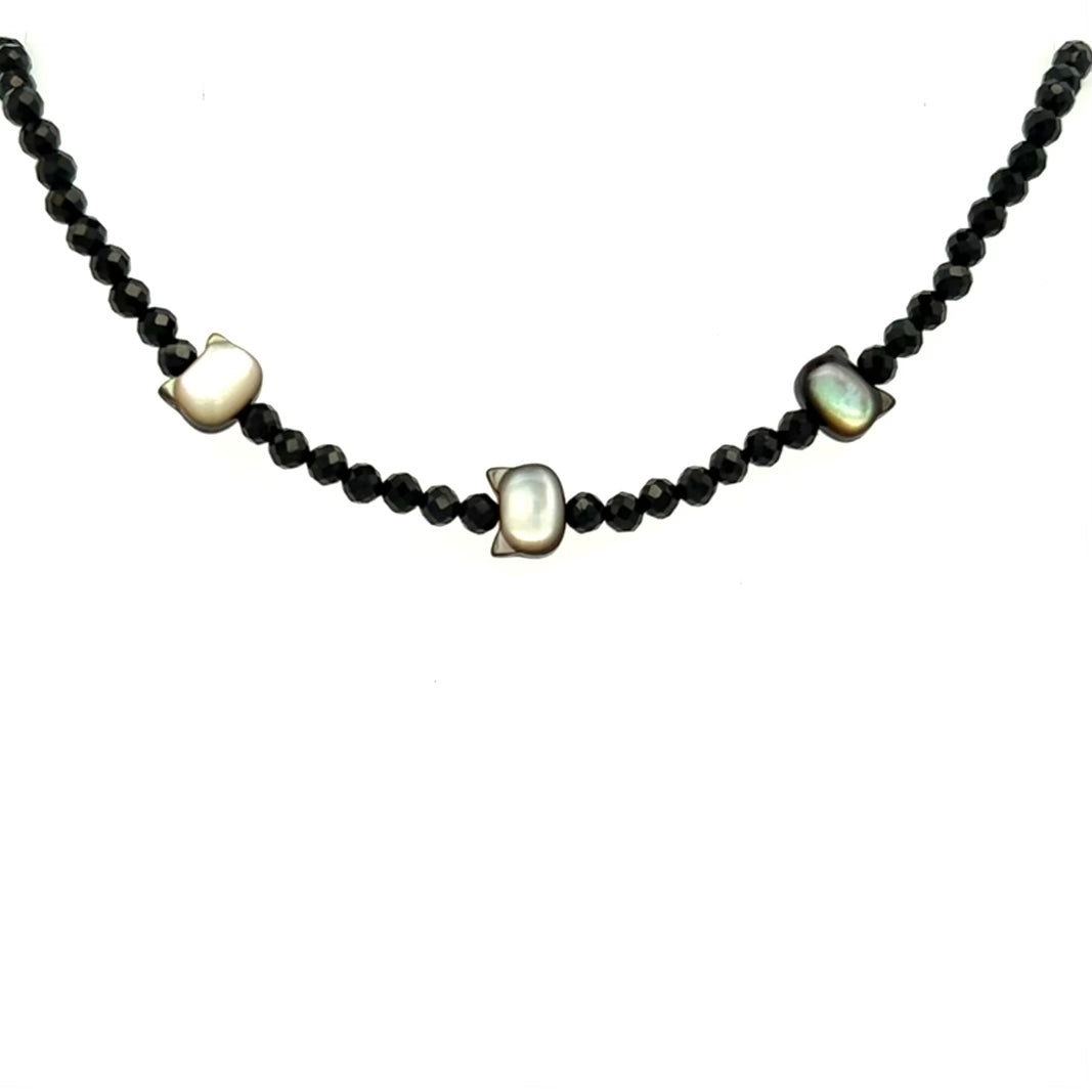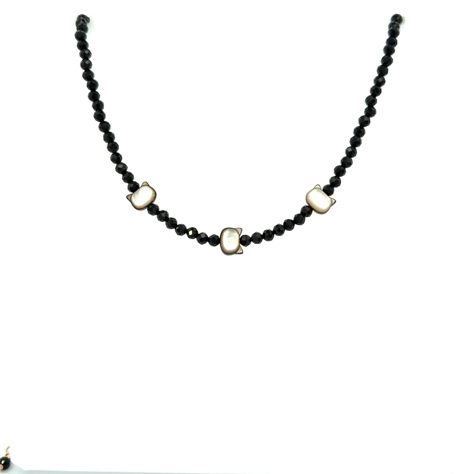 Dainty Black Spinel Choker Necklace With Cats of Black Mother of Pearl 14k GF Gold