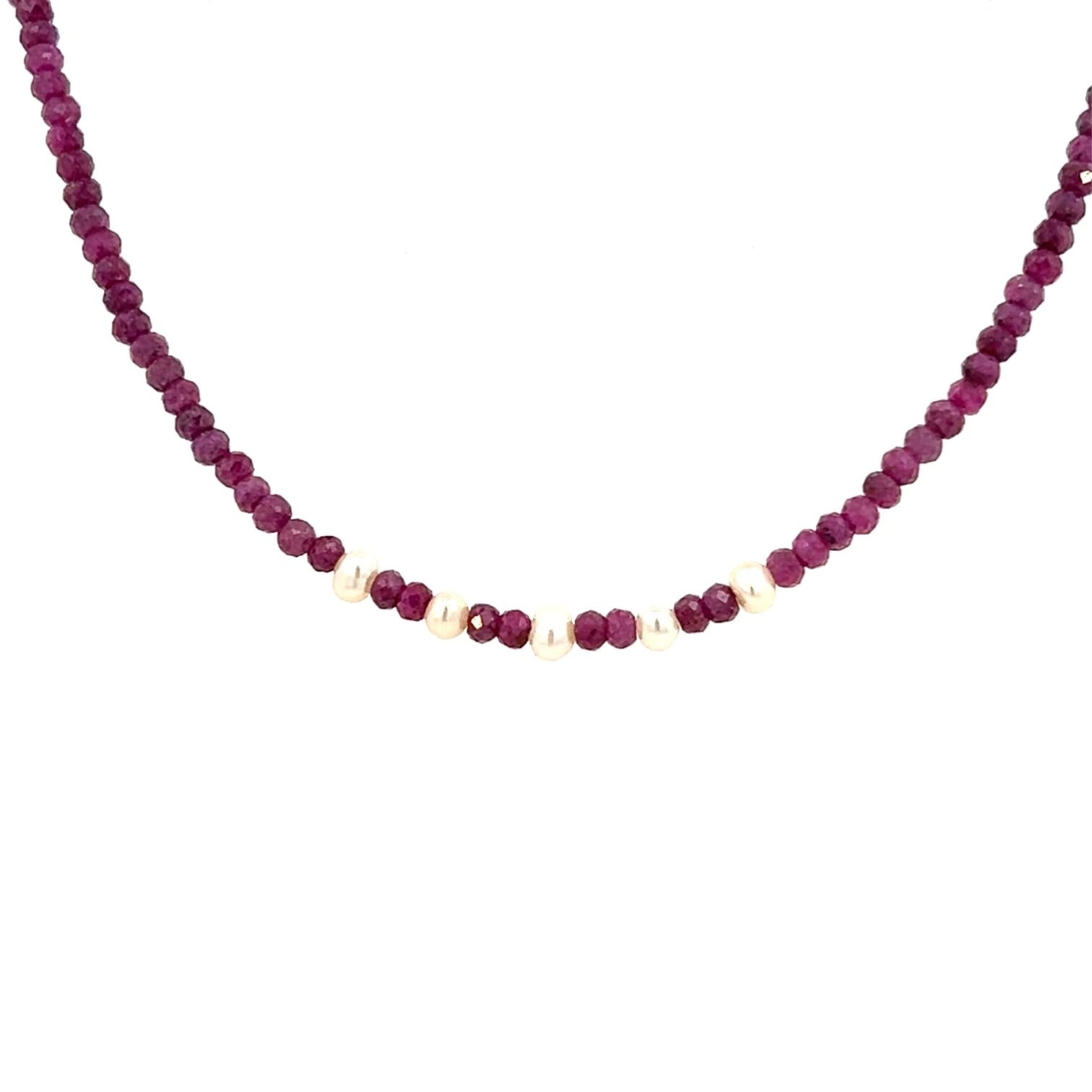 This is a natural gemstone Ruby and Pearl choker necklace. It can be worn as a loose choker or necklace and is approximately 17-19” in length. The extender chain and lobster claw clasp are 14k gold filled. The Ruby beads are a beautiful plum-red color and have not been dyed or treated. The Pearl is a fresh water cultured Pearl with natural color. The Ruby beads are 3 mm and the Freshwater Pearls are 3-4 mm in size. You will love this elegant choker/ necklace.
