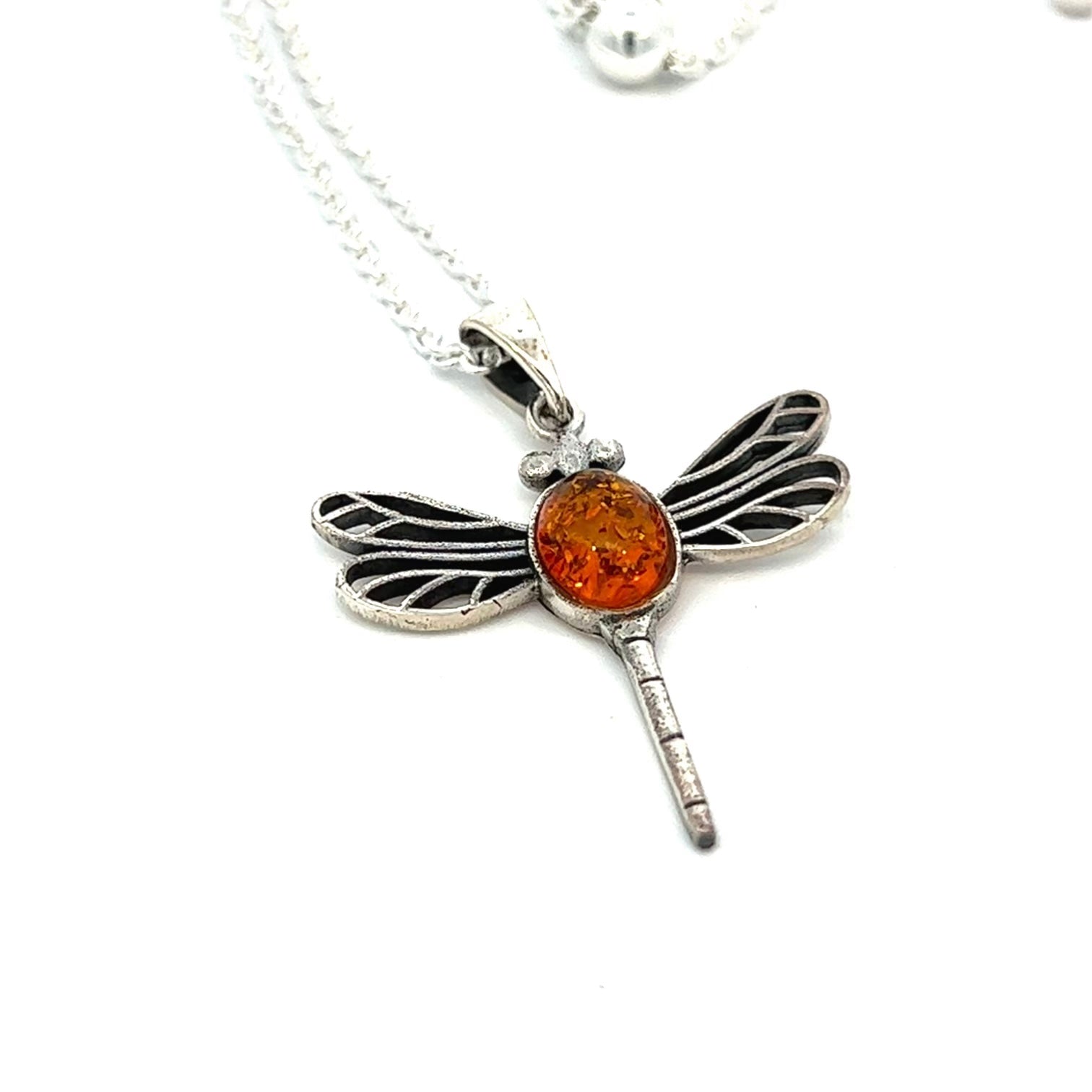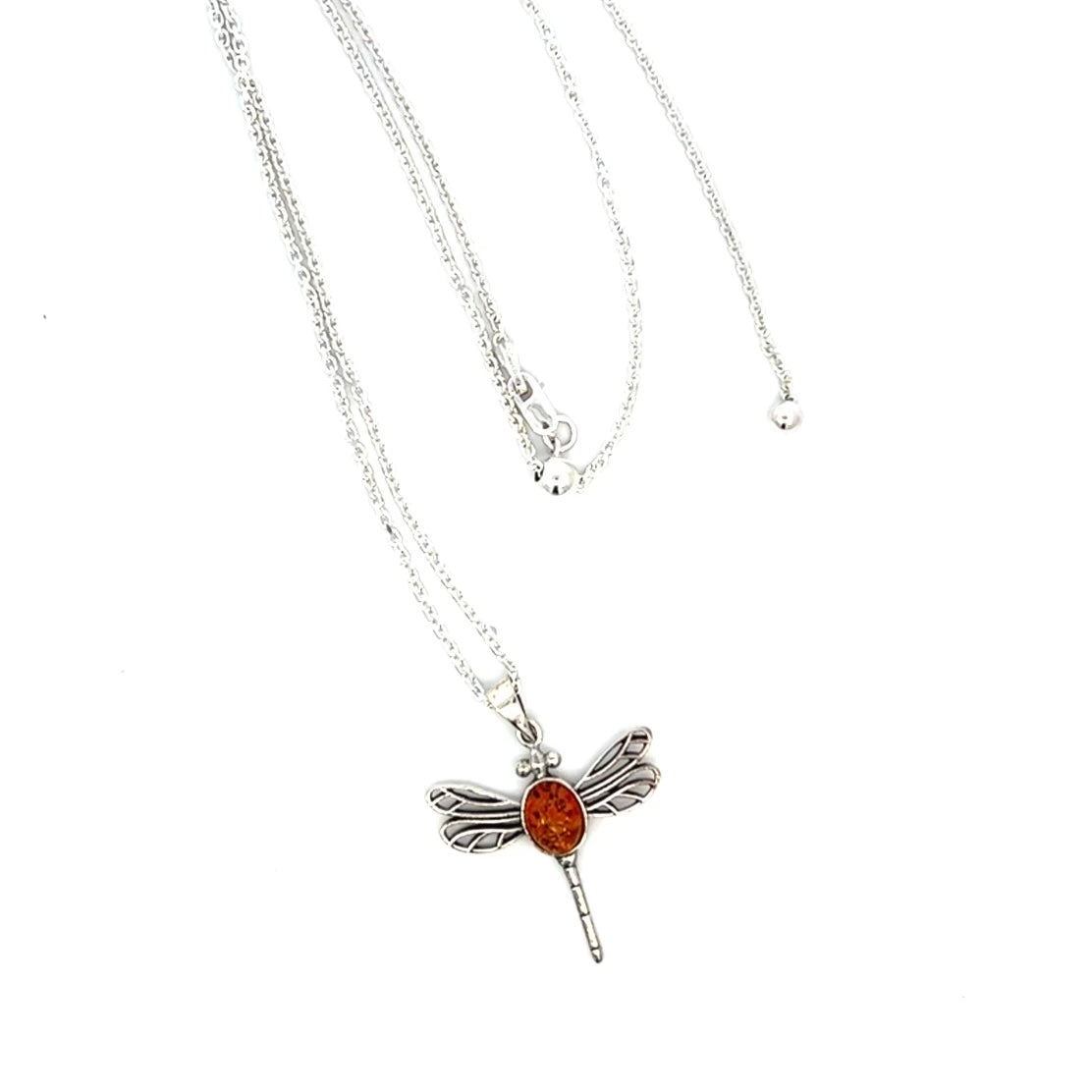 Amber Dragonfly Pendant Necklace with Amber Adjustable Sterling Chain