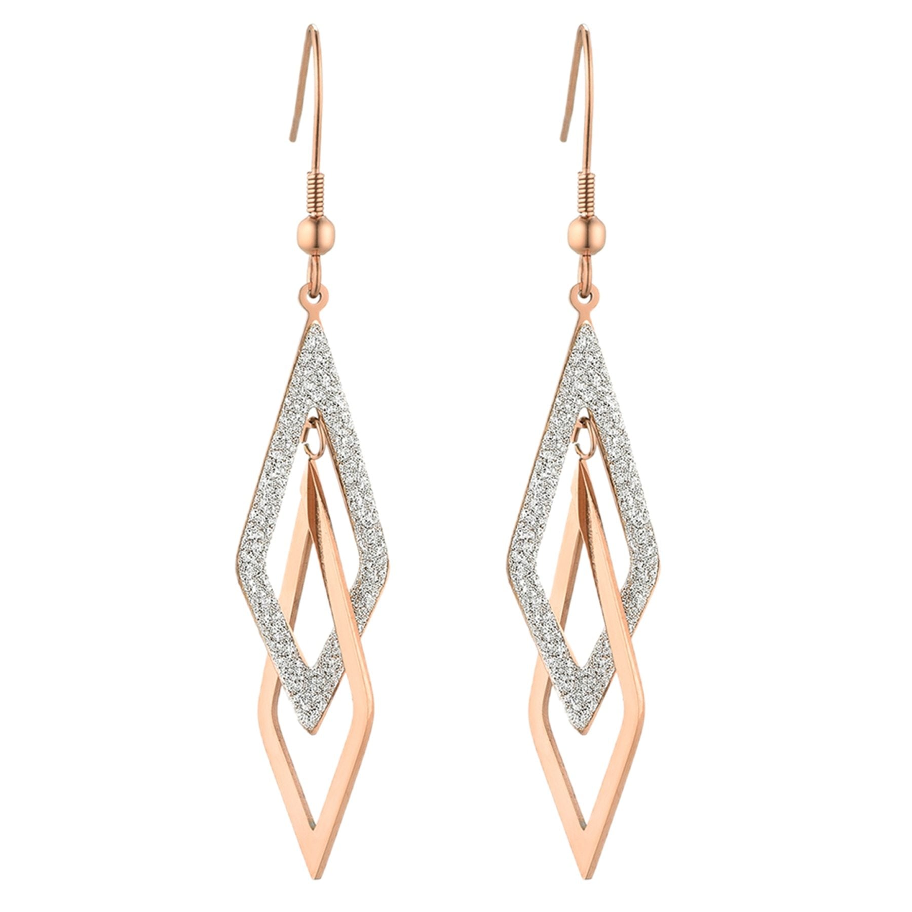 These beautiful, contemporary earrings are classy, sassy and sparkly! These will dress up any outfit. They are about 2 1/4” in length on Shepherd hooks. These are made of stainless steel and have a slight rose gold finish that will blend nicely with other gold or rose gold items if you want to match.