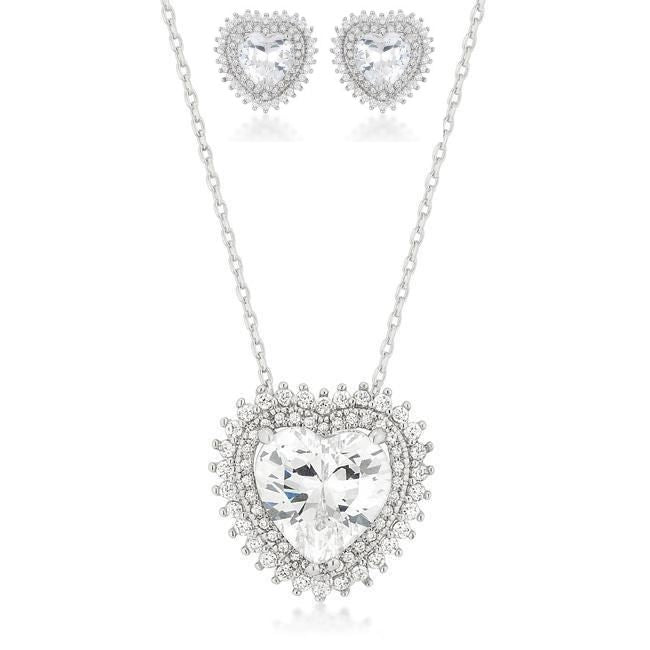 This is a fabulous halo heart pendant necklace and earrings set. The genuine rhodium finish is achieved using an electroplating process that coats the item with heavy layers of rhodium, a close cousin to platinum, which gives our jewelry a platinum luster. The pendant is about 1/2” wide. The chain is 16” with a 2” extender. The matching stud earrings come along with this gorgeous set.
