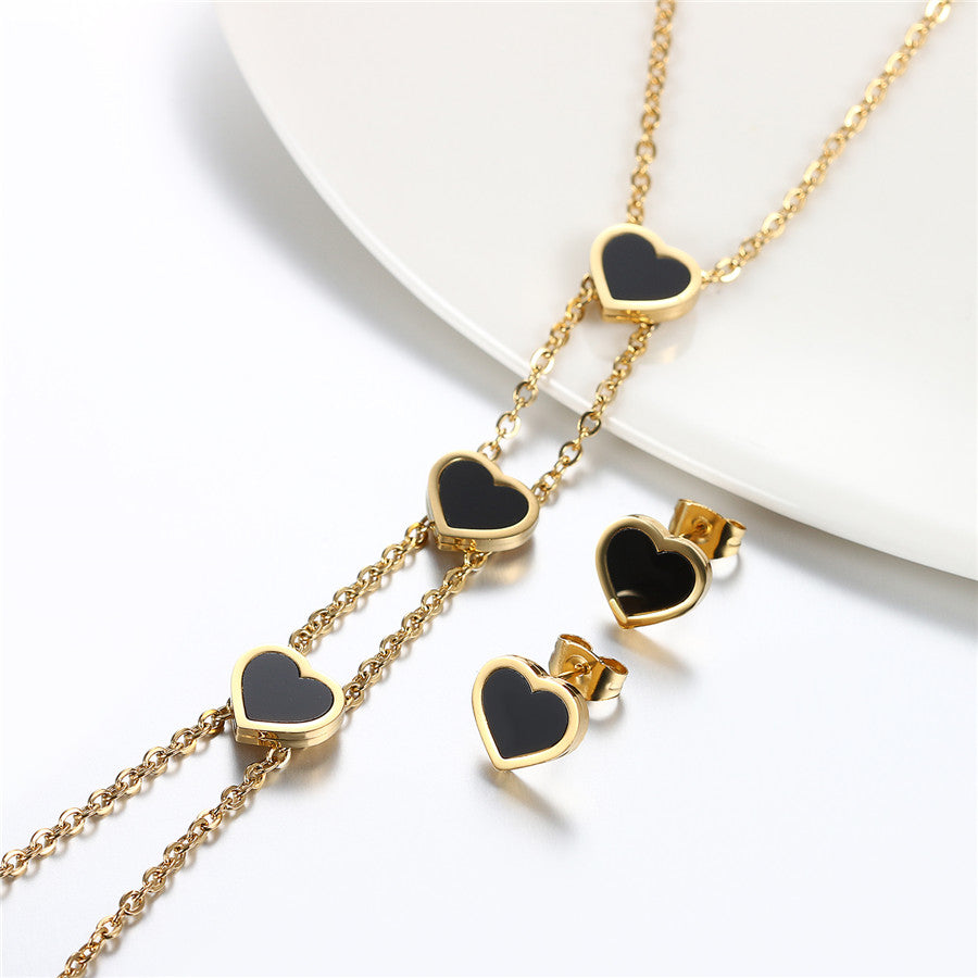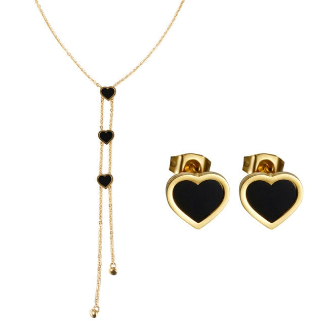 This is gorgeous triple heart lariat necklace with matching earrings set. The necklace is an on-trend lariat or Y style. The hearts are a black enamel on the necklace and stud earrings. You can choose gold or silver tone. These hearts are all about 3/8” wide. The chain is 20” plus a 2” extender with a lobster clasp. The drop portion of the chain is about 5 1/4” in length. This is a nice quality set that would make a great gift. The are made of stainless steel and you can choose gold or stainless tone.