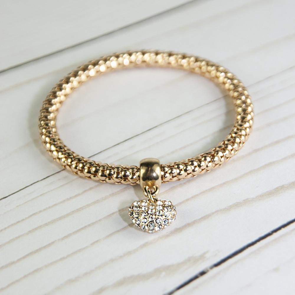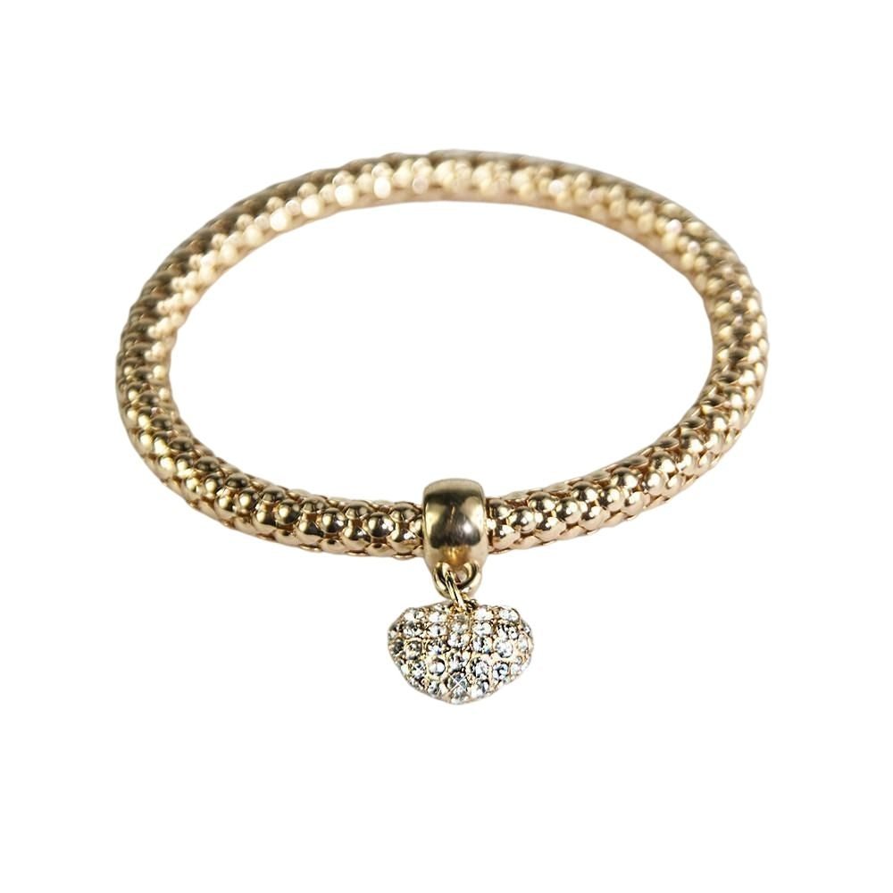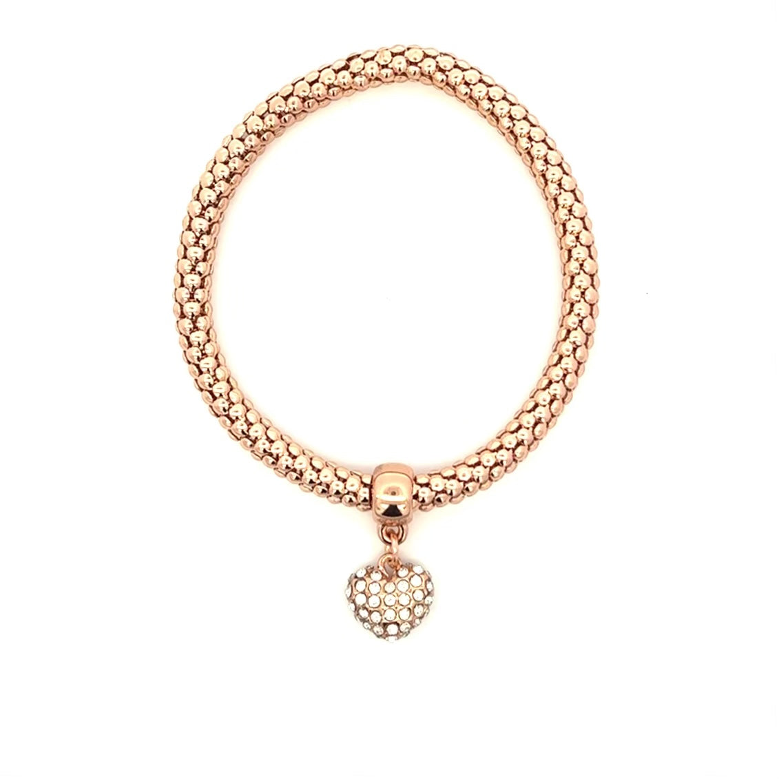 This is a rose gold tone, metal stretch bracelet with a sparkly heart pendant. This is a fun, unique bracelet that will look great alone or with others in your stack. It will look great alone or stacked with other bracelets. Fits a small to average wrist.
