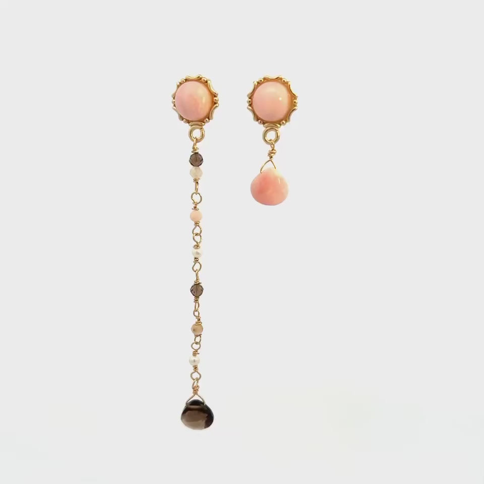 The longer earring, about 3” long, has beaded Smoky Quartz , Pink Opals and fresh water pearls with a dangling smoky quartz drop at the end.