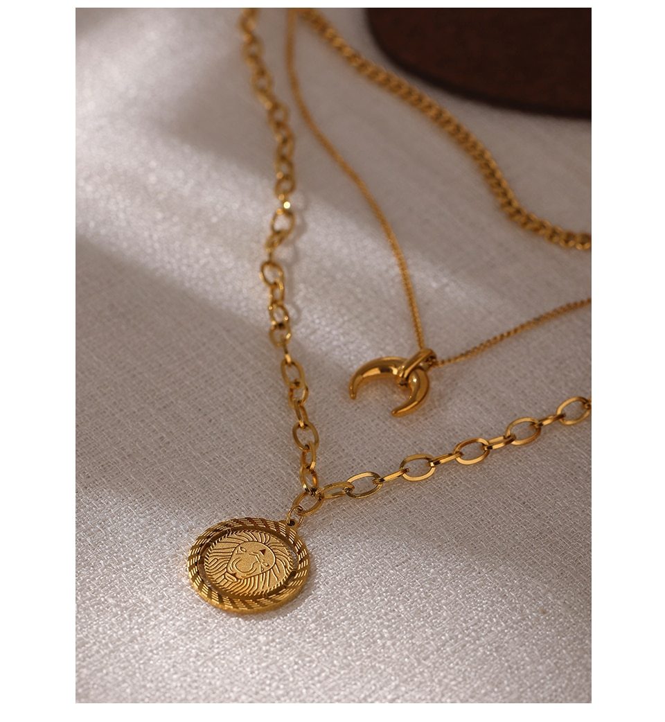Layered Double Horn Crescent and Lion Pendant Necklace
