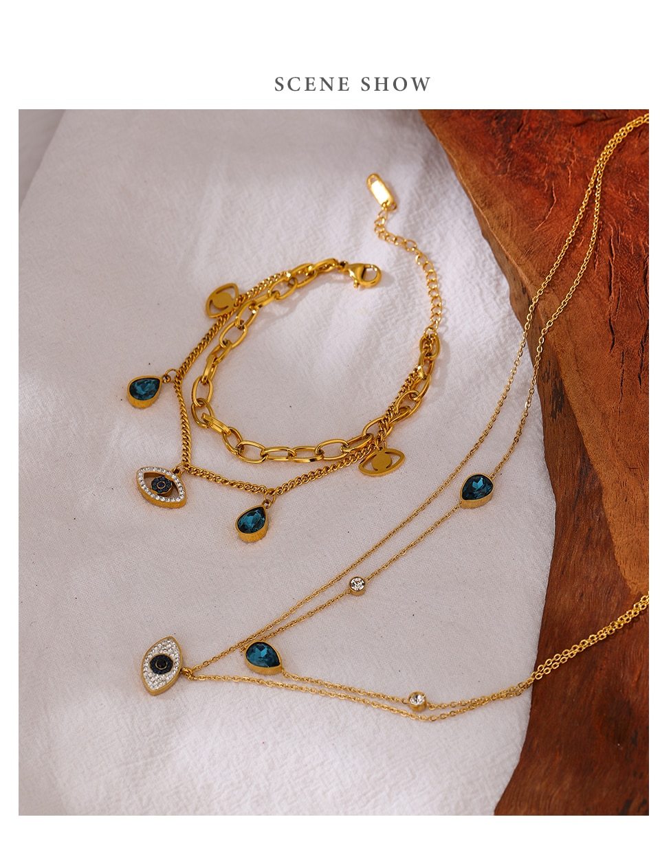 This beautiful double chain evil eye necklace has an eye pendant on one chain and blue and clear rhinestone accents on the other. It is about 16” - 16.5” with a 2” extender chain.The matching bracelet is sold also. Protect yourself from ill will and misfortune with this beautiful necklace.