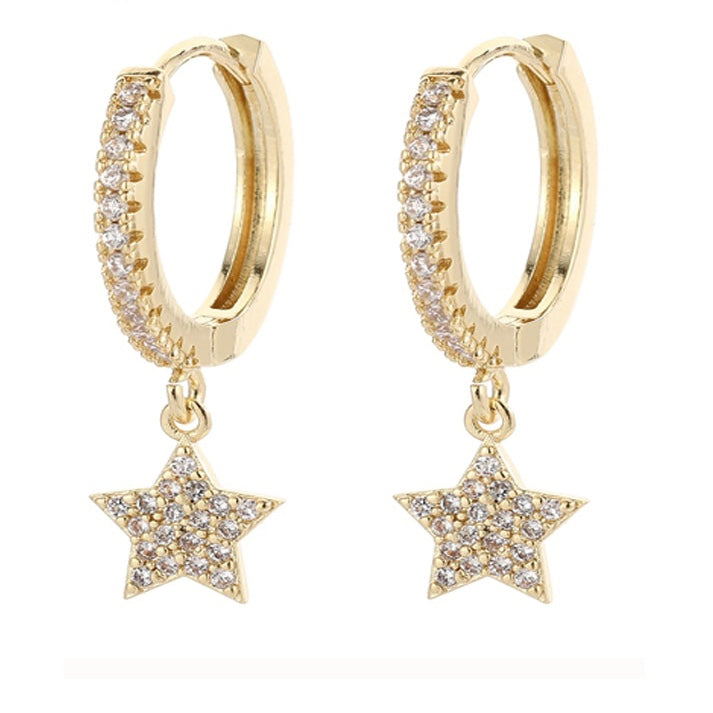 These are an adorable pair of Huggie Hoop Earnings with mini sparkling Star charms. These are slightly over an inch in length. They have a touch of sparkle and movement that will elevate your style.