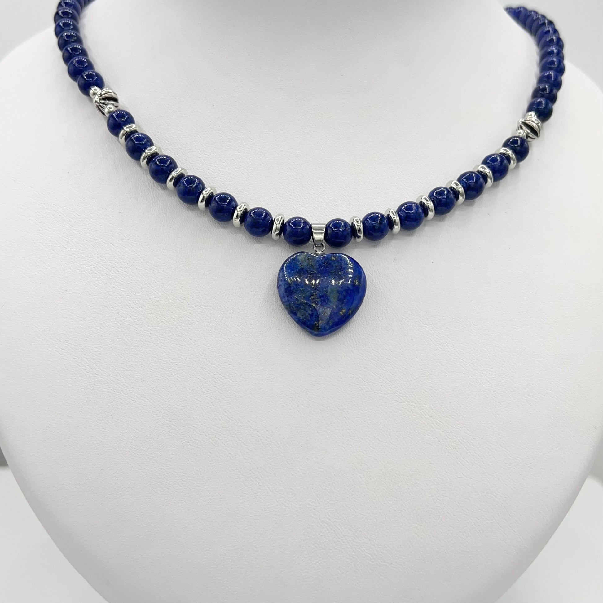 This is a gorgeous Natural Gemstone Lapis Lazuli necklace with Lapis heart pendant. Lapis becoming more scarce every day, especially since the US exit from Afghanistan, so this is a great opportunity to get a gorgeous necklace at a great price. The lapis beads are 6mm and the heart pendant is about 1” x 3/4”. The lobster clasp and chain are silver tone. This is adjustable from 20-22”. This would make a lovely gift and will arrive gift boxed with a bow.