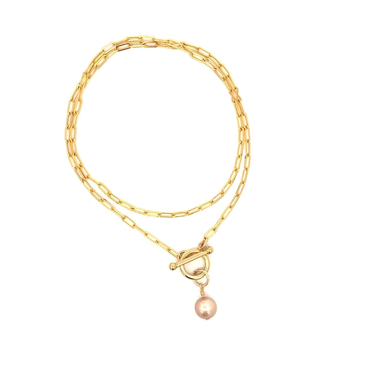 Paperclip Chain Pearl Necklace Front Toggle 14k GF