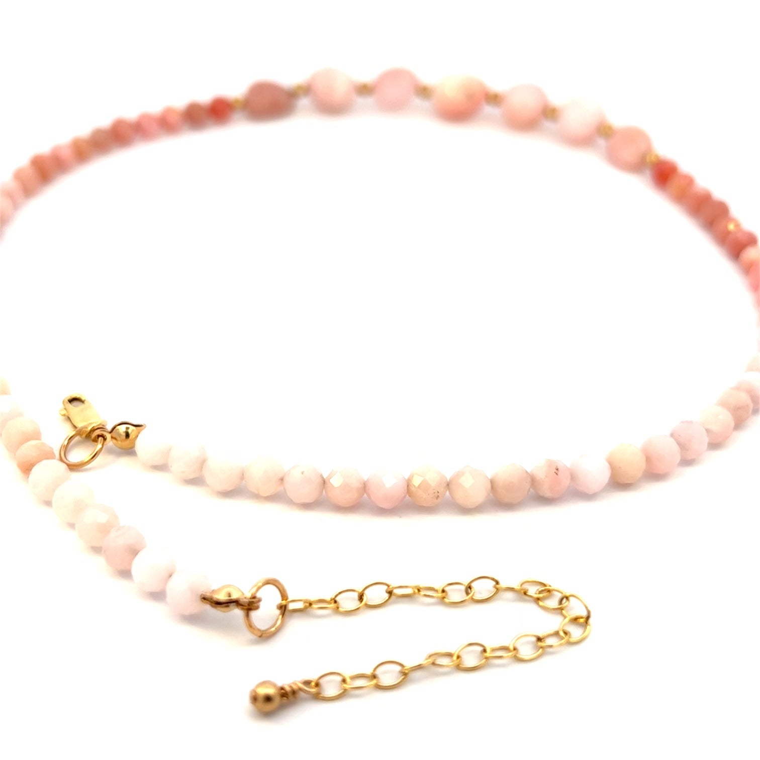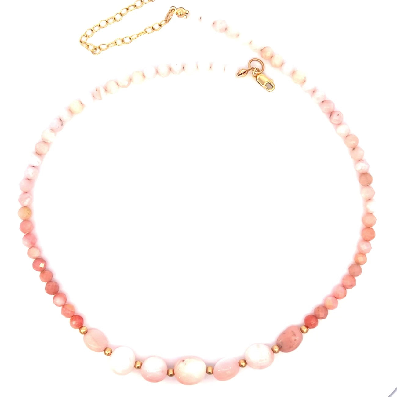 This is an exquisite Peruvian Pink Opal necklace with 14k gold filled lobster clasp and extender chain. Pink Peruvian Opals are rare and especially rare with few to no dark spots. The natural, free form nuggets and faceted beads on this necklace are A+ quality with few imperfections. The small faceted beds are arranged in a slight ombre pattern and range in color from light pink and peach/pink to white. The chain is adjustable from about 17-19” and has a lobster clasp. This would be a treasured gift for someone special or a piece you will cherish forever.