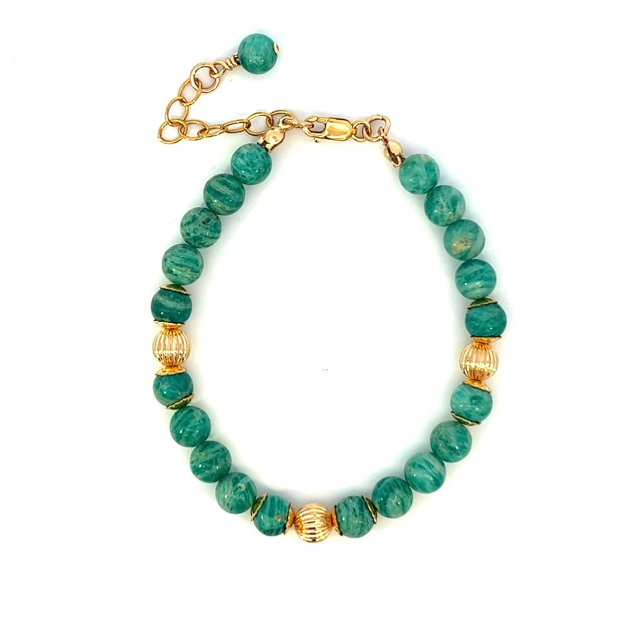 Natural Gemstone Amazonite Bracelet with 14k GF beads and extender chain. The Amazonite stones are a very unusual shade of greenish blue with different shades of banding. This is 7 -8” and fits an average size wrist. 14k GF lobster claw clasp, beads and chain. This would make an incredibly unique gift as these stones are extremely rare.