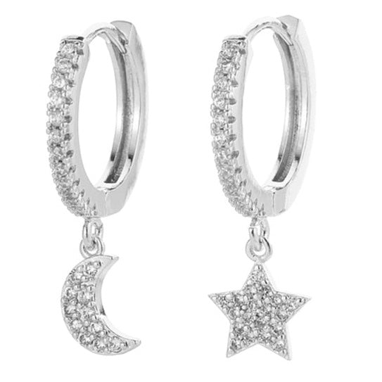 Mini Huggie Hoops Dangle Earrings Star and Moon Gold or Silver