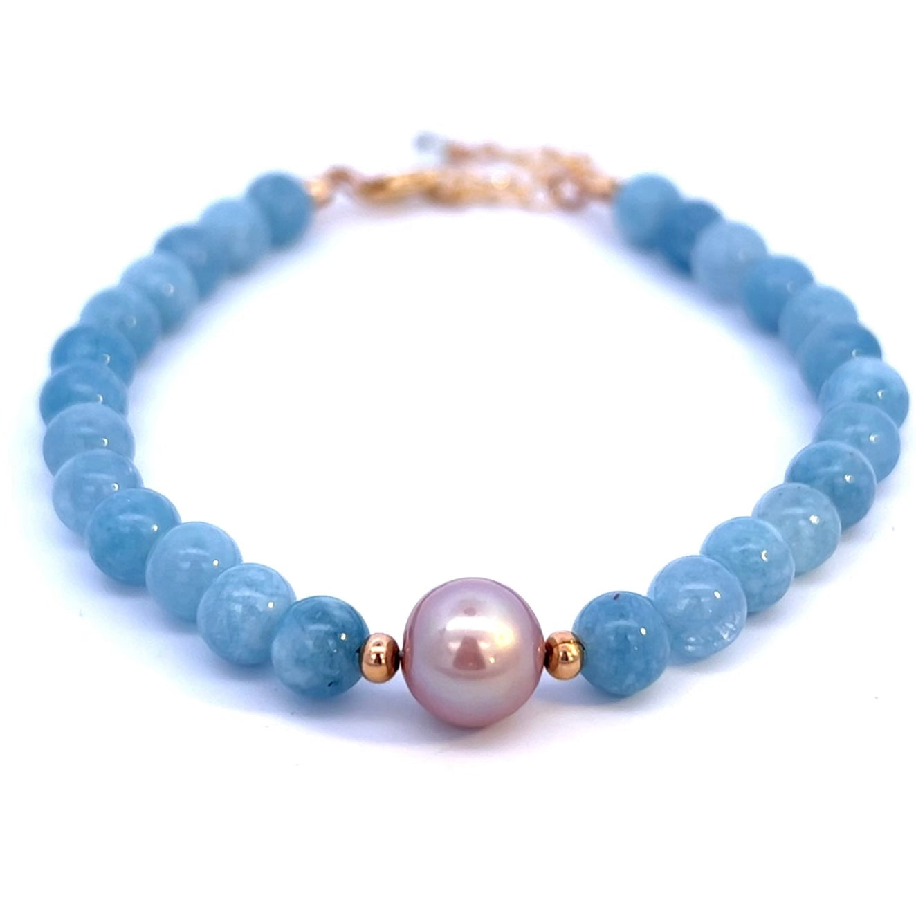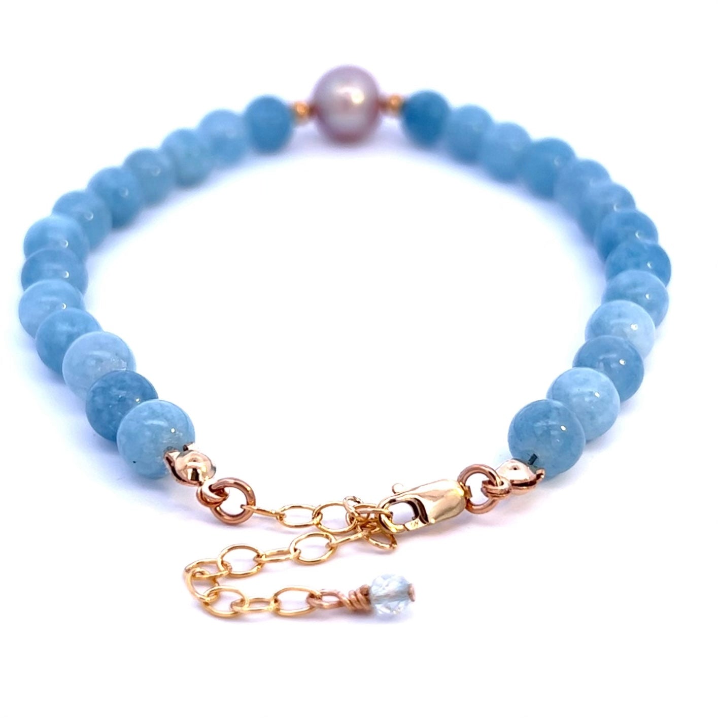 This is a Natural Gemstone Aquamarine and Pearl Bracelet. This gorgeous bracelet is made with AAA Aquamarine beads and a very special, pale pink freshwater Pearl focal bead. Aquamarine is the March birthstone. The lobster clasp, accent beads and extender chain are 14k gold filled for lasting beauty.