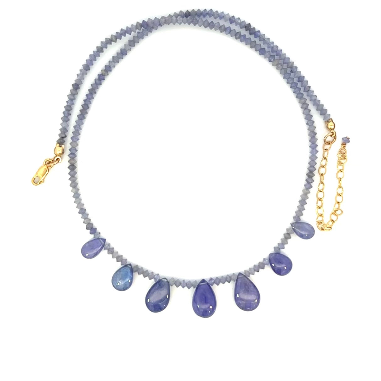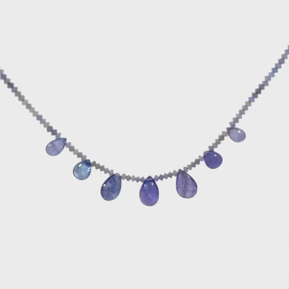 This is a gorgeous genuine Tanzanite Necklace with briolettes or small pear shape charms. The charms are graduated in size from 1/4” to 1/2”. The blue violet charms are quite gemmy and the light clearly shines through them. The small beads on the chain are light Violet bicones. This one of a kind necklace is about 17” plus a 3” extender. The lobster clasp and extender chain is 14k GF.
