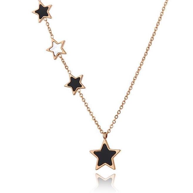 This is a dainty star necklace in rose gold tone. The celestial stars are in stylish black and silver enamel. There are three smaller stars on the side chain and a larger Star as a pendant. This is the perfect, on-trend piece to add to your necklace layers....or perfect alone. It is about 16.5” + 2” extender chain. Made of stainless steel with rose gold plating and enamel painted stars.