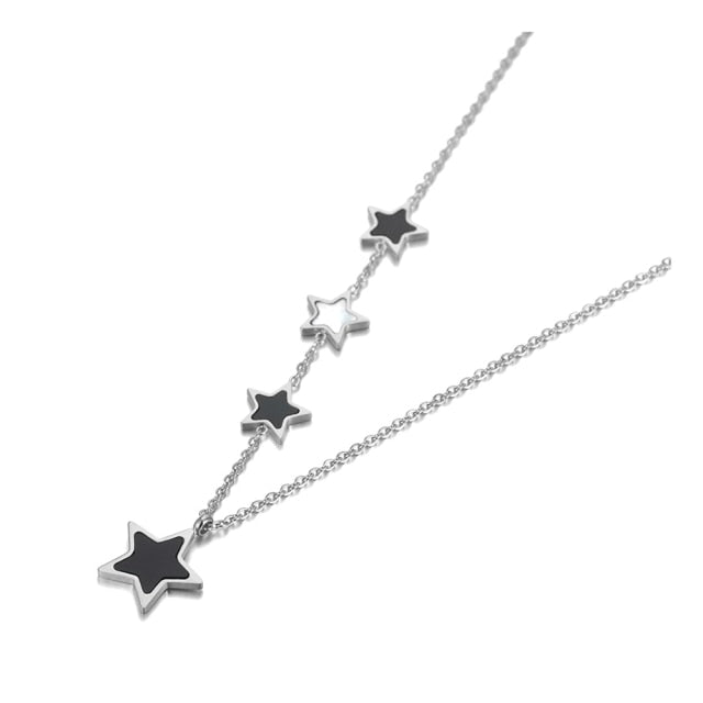 This is a dainty star necklace in silver tone. The celestial stars are in stylish black and silver enamel. There are three smaller stars on the side chain and a larger Star as a pendant. This is the perfect, on-trend piece to add to your necklace layers....or perfect alone. It is about 16.5” + 2” extender chain. Made of stainless steel and enamel painted stars.